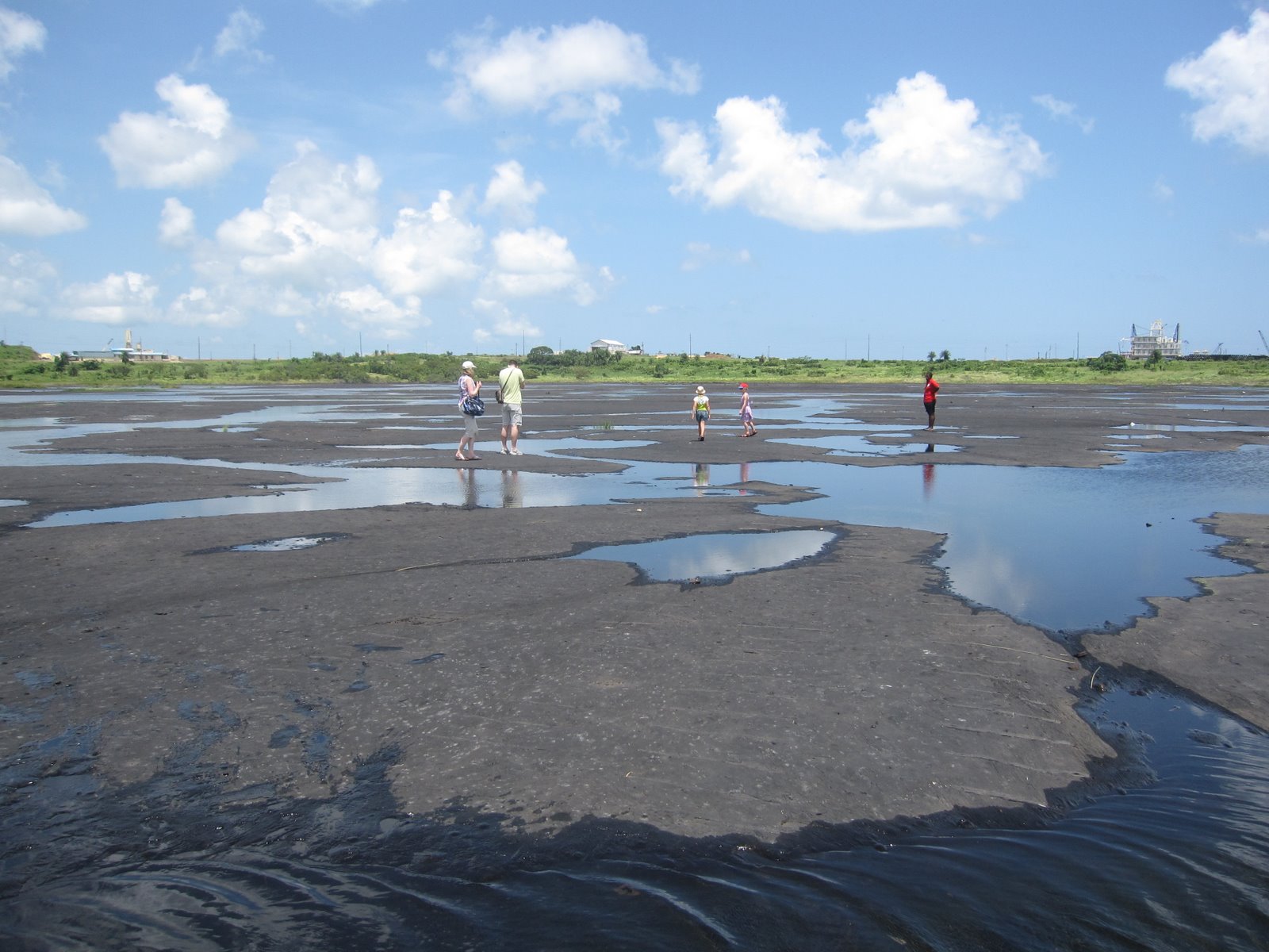 Am zweiten Tag fahre ich ganz in den Süden, um mir den „Pitch Lake„, einen natürlichen Asphaltsee, anzuschauen. Es gibt nur 3 von diesen Seen weltweit, und der Asphalt von Trinidad war (und ist wohl immer noch) weltberühmt. Die frühen Seefahrer waren des Lobes voll über die schwarze Masse, die sie zum abdichten ihrer Schiffe benutzten. Später dann, als der industrielle Abbau des Asphalts bereits in vollem Gang war, wurde das Material bis nach Ostdeutschland geschafft, wo es u.a. im Autobahnbau verwendet wurde. Auch heute noch wird fleissig Asphalt abgeschöpft und in alle Welt verschifft. Man kann den See zu Fuss begehen und mit einem Guide darüberwandern. Ab und zu sieht man Baumstämme, die aus der Tiefe und Vergangenheit an die Oberfläche gelangen, wie auch schon ganze Skelette von Urgetieren und -pflanzen.