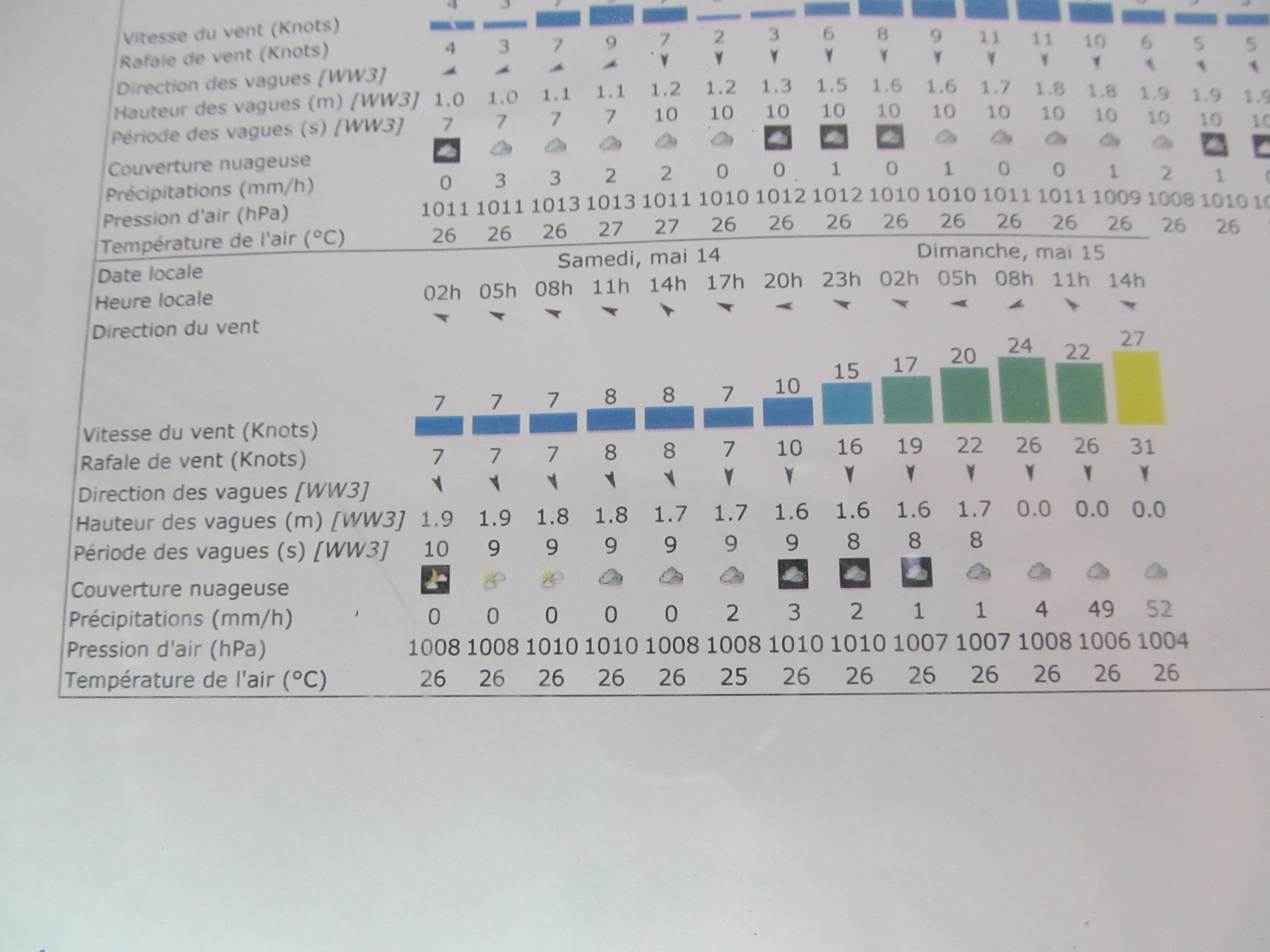 Das Boot ist randvoll gefüllt mit Zwieback, Pökelfleisch und Zitronen, wie in den guten alten Zeiten. Nun hoffen wir, dass der Skorbut keinen grossen Tribut fordert. Ha! Wer’s glaubt! Wir essen hier doch nicht wie die Klabautermänner. Neinneinnein. Der Einkaufszettel vom vergangenen Mittwoch listet für den bescheidenen Betrag von $793.60 unter anderem das folgende auf: 2kg Zwiebeln, 3kg Spaghetti und andere Pasta, Stocki und Reis, 15 Liter Milch, 36 Liter Wasser in Flaschen, Säfte, 6kg Äpfel und Birnen, 2.5kg Thon und Lachs in Dosen, Halbrahm, Mehl und Crème fraiche (wofür wohl?), 5kg Kartoffeln, ca. 5kg Büchsenmais, -erbsen und -rüebli, 3kg Fischfilets, 3kg Pouletbrust, Salami, 3 lt Rum aus Martinique plus eine Flasche Sirop de Canne und ein Kilo Limetten (für unzählige Ti-Punchs), Cola, Tee, Kaffee, Bouillon, Zucker, Salz, Pfeffer, Mayonnaise (nur aus Dijon, vergiss die amerikanische), Senf (dito), eingebüchste und frische Tomaten, Fertigsauce, einige Kilo Brot, ein kompletter Goudakäse für 2.5 kg, Fertigsuppen, Pommes Chips, frische Peperoni und Gurken, etc. etc., totalemente 3 Einkaufswagen voller Futter. Bon appetit!