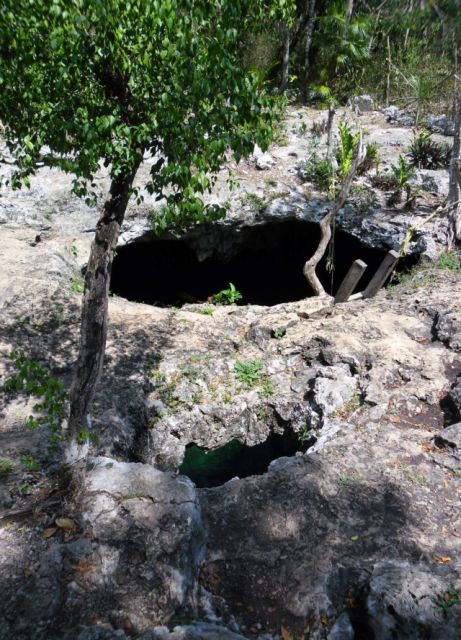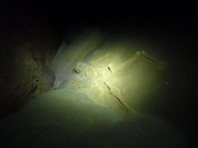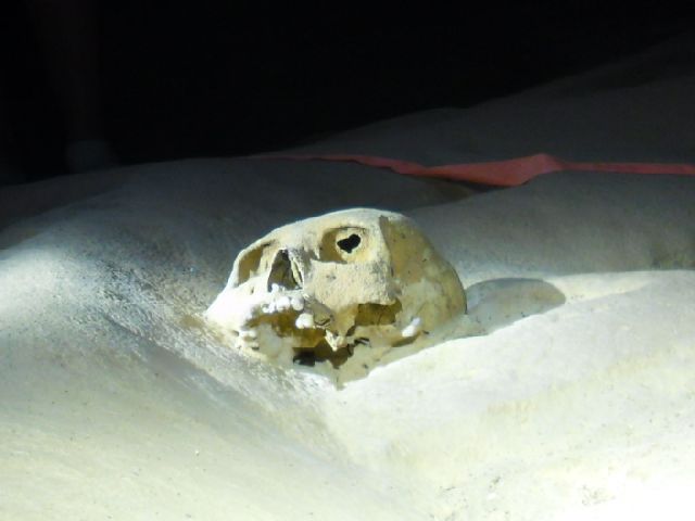 Im hinteren Teil der Höhle, den wir nach ca. 1.5 Stunden erreichen, gibt es auch Überbleibsel von menschlichen Opfern: insgesesamt wurden 14 Skelette entdeckt, die immer noch da sind, von Kindern über junge Frauen bis zu erwachsenen Männern. Es ist unklar, ob diese Opfer sich freiwillig dem Ritual unterzogen haben (die Kinder sicher nicht), Indizien an dieser und an anderen Stätten sprechen jedoch dafür, dass zumindest einige davon ihr Schicksal akzeptiert haben (so haben sich z.B. einige Opfer selber eingemauert und sind dann, nachdem der Zugang sauber von innen zugepflastert wurde, erstickt). Das alles ist natürlich sehr interessant, und unser Guide, selber ein Maya-Abkömmling, gibt sich alle Mühe uns das alles äusserst detailliert und ansprechend interpretiert darzubieten. Ein wenig Enttäuschung über die verpasste Gelegenheit, eine echte Höhlenbegehung zu machen, bleibt jedoch zurück.